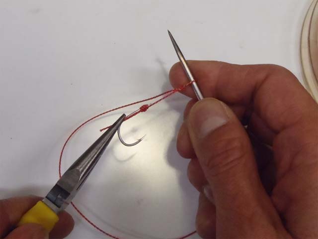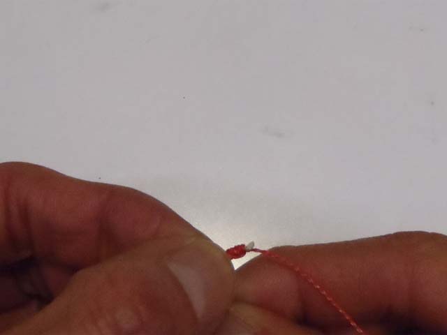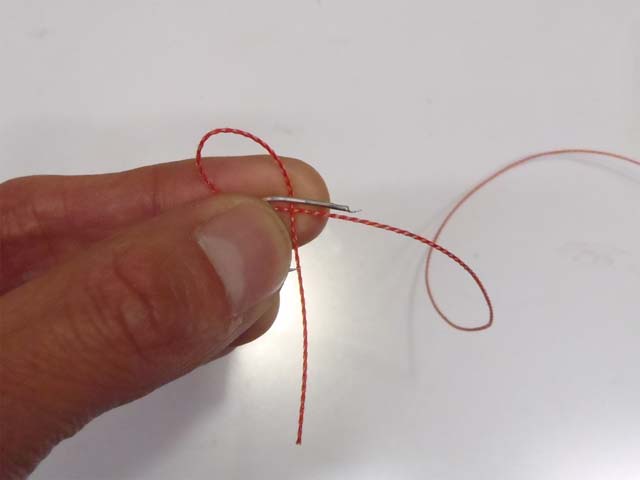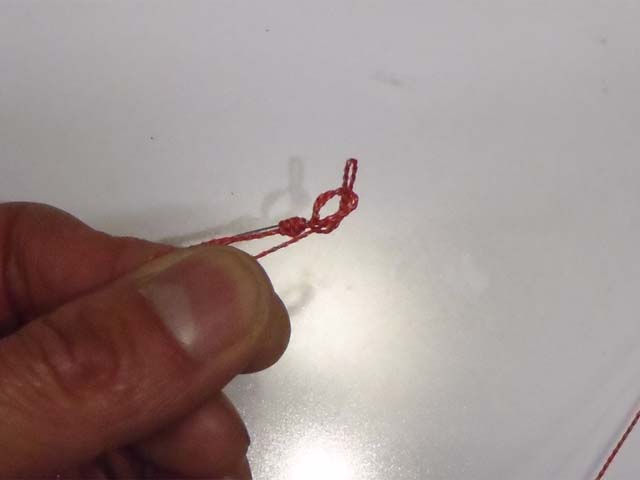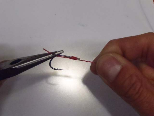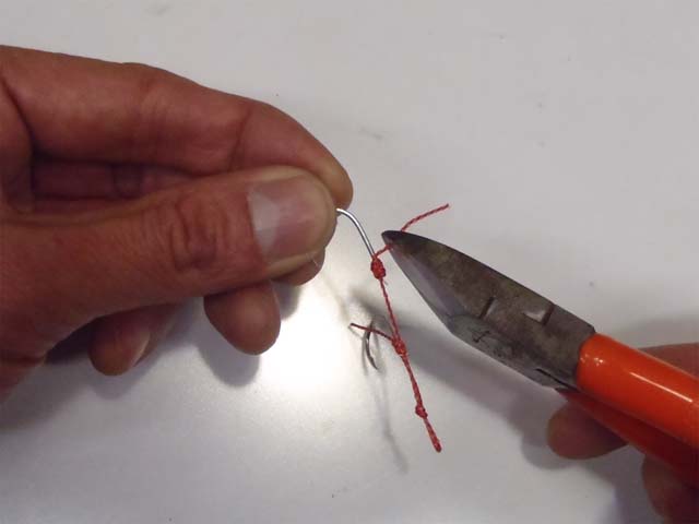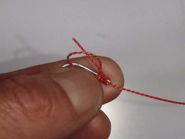 結びコブを、ハリの撞木までズラします。接着剤を使うまでは、結び目の巻きつけがふくらんでしまうので、ハリを引っ張っての締め付けはしません。