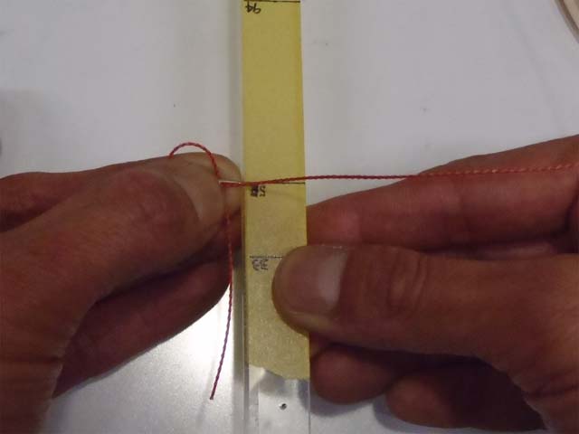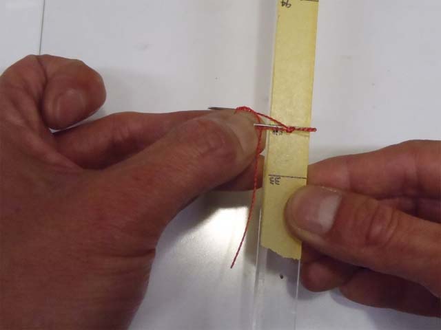 次に、冶具を使って、結びコブの頭から33mmの位置に、ラインに折り目をつけます。