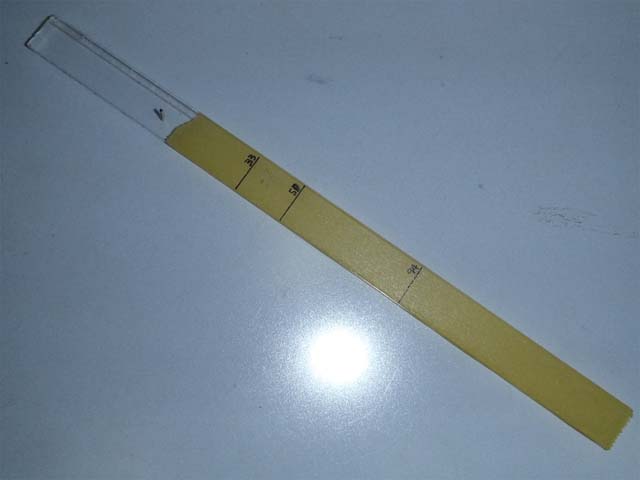 冶具はプラスティックボードに直径1mm・長さ数ミリのピンを打ってあります。割り箸と細いクギでも代用できると思います。目盛りは、ピンの遠い側からそれぞれ、33mm・50mm・94mmのところに書いてあります。別寸法のモノも作れるように、マスキングテープの上に書いています。