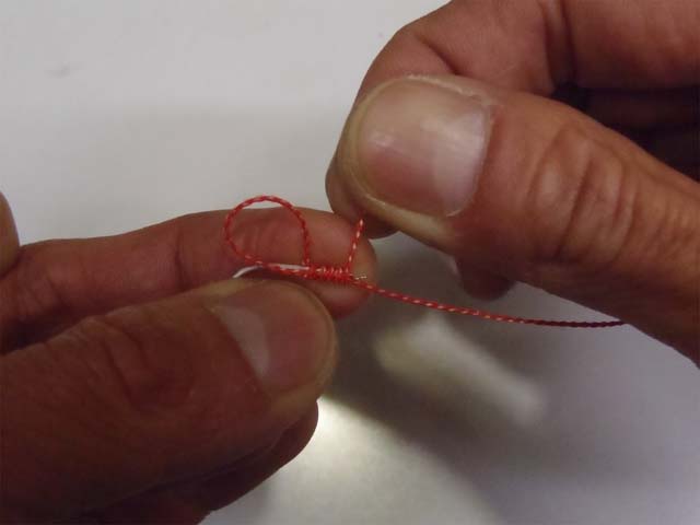 折り目を先端として、チチワを作ります。 PEラインを使う場合は、エイトノットにします。
